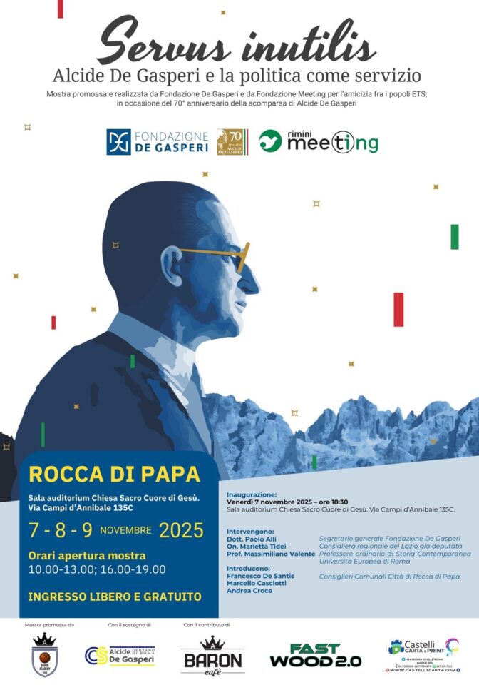 “Sarà inaugurata venerdì 7 novembre, presso la Sala Auditorium della Chiesa del Sacro Cuore di Gesù ai Campi d’Annibale, la prestigiosa mostra della Fondazione De Gasperi intitolata “Servus Inutilis”, dedicata alla vita e all’opera di Alcide De Gasperi, padre della Repubblica e figura centrale della storia politica italiana del Novecento.