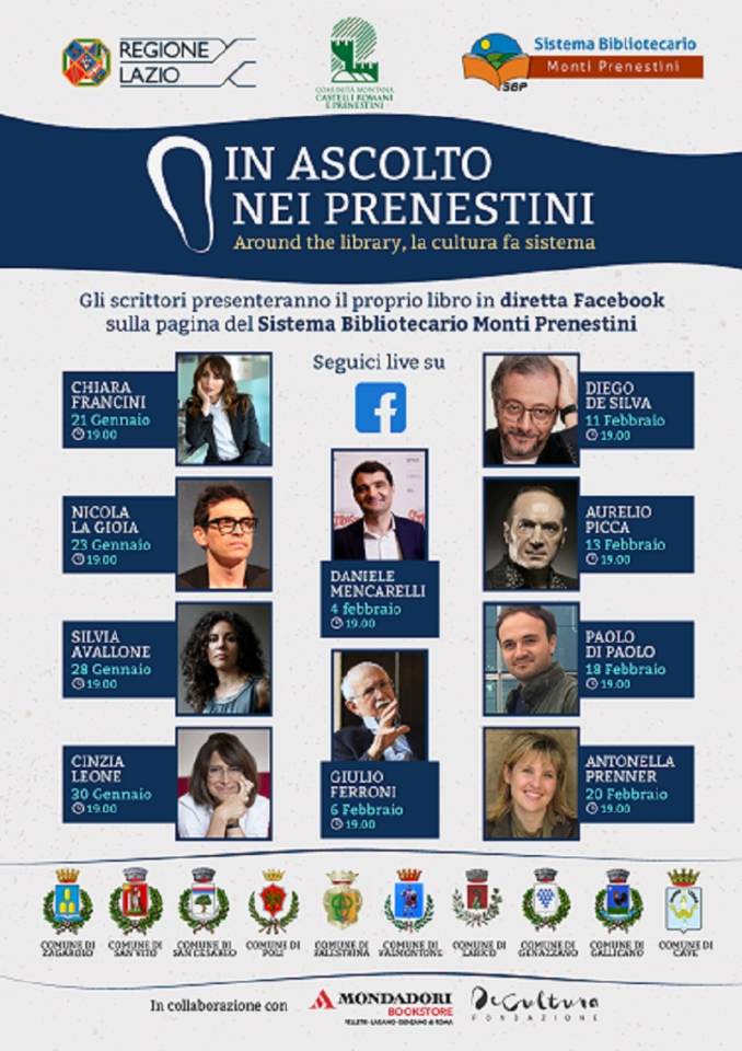 Il Sistema Bibliotecario Prenestino e la Comunità Montana dei Castelli Romani e Prenestini in collaborazione con la Regione Lazio, la Fondazione De Cultura e la Mondadori Bookstore Velletri-Lariano-Genzano, stanno organizzando e promuovendo una serie di incontri con alcuni degli autori contemporanei più apprezzati della narrativa italiana.