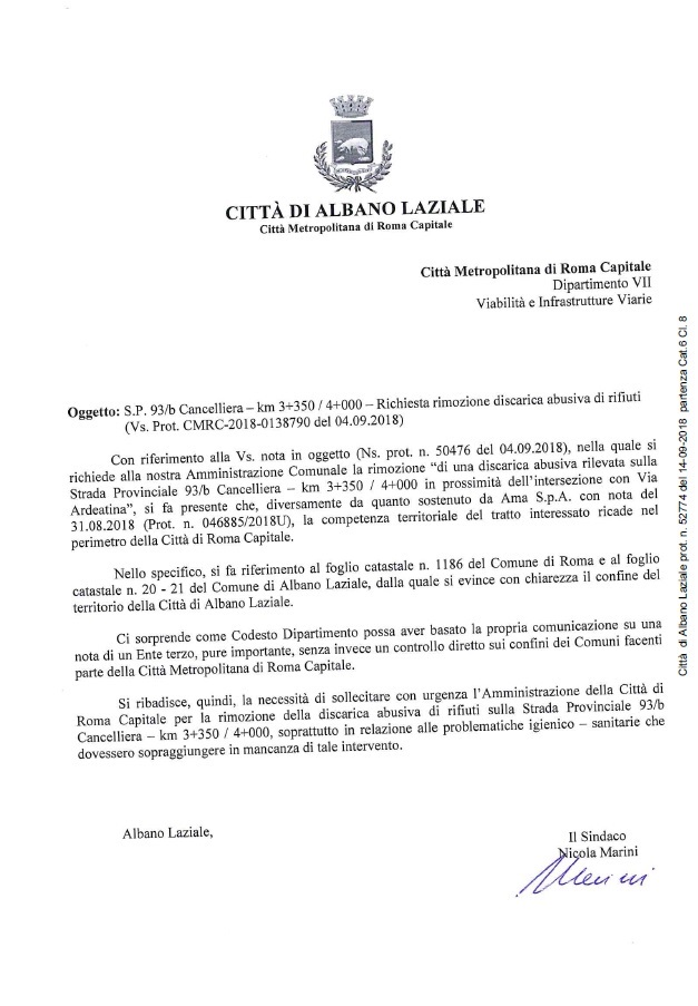 Il Sindaco Nicola Marini ha sollecitato la rimozione della discarica abusiva sulla Strada Provinciale 93/b Cancelliera – km 3+350 / 4+000 in prossimità dell’intersezione con Via Ardeatina. La missiva, a firma del primo cittadino, è stata indirizzata alla Città Metropolitana dopo che da Palazzo Valentini era stato formalmente richiesto all’Amministrazione Comunale di Albano Laziale di bonificare l’area nonostante quella porzione di territorio ricada all’interno dei confini del Comune di Roma Capitale.