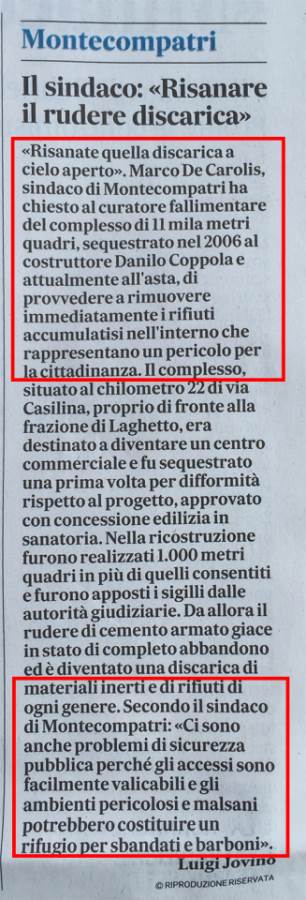 Il primo cittadino, sulle colonne de “Il Messaggero”, chiede al curatore fallimentare di provvedere – esordisce così nella nota il segretario, Fausto Bassani, e il Pd di Monte Compatri – alla bonifica dell’immobile. Il 26 Agosto scorso il Pd di Monte Compatri aveva denunciato una discarica abusiva sorta nello scheletro di cemento che si apre sulla Via Casilina provenendo da Colonna. “Chiediamo immediatamente al sindaco e all’Amministrazione comunale – avevamo scritto nel comunicato sopra menzionato – di scrivere un’ordinanza attraverso la quale si bonifichi l’area ed obblighi i proprietari dello scheletro in cemento armato la messa in sicurezza del manufatto”. Il sindaco De Carolis e l’amministrazione comunale avevano risposto con la solita manfrina della polemica politica dichiarando che “quella struttura non può essere evidentemente soggetta ad interventi di bonifica fino alla sentenza definitiva dei giudici”. La replica del Pd fu secca e immediata e recitava così: “Lei (il Sindaco n.d.g.) deve intervenire ugualmente ordinando al custode giudiziario la bonifica dell’area. Prenda forza dalle sue responsabilità. Credevamo che queste prassi le conoscesse, visto che si vanta di essere avvocato. Il Pd di Monte Compatri ha fatto il proprio dovere denunciando a lei una situazione di illegalità che mette a rischio la salute pubblica. Monitoreremo quotidianamente la situazione e se non vedremo interventi di bonifica immediati saremo costretti a rivolgerci direttamente alla Procura della Repubblica”. Sulle colonne della cronaca locale de Il Messaggero di oggi, un articolo riporta la dichiarazione del sindaco De Carolis che “chiede al curatore fallimentare del complesso di 11mila metri, sequestrato nel 2006 al costruttore Danilo Coppola e attualmente all’asta, di provvedere a rimuovere immediatamente i rifiuti accumulatisi nell’interno che rappresentano un pericolo per la cittadinanza”.