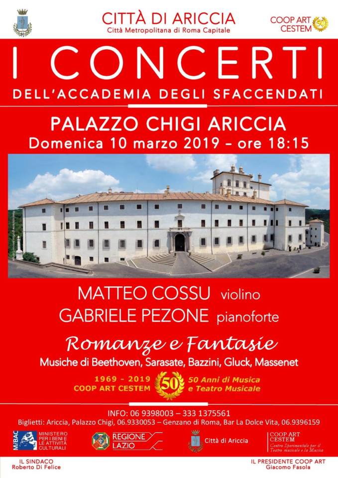 I Concerti dell’Accademia degli Sfaccendati al Palazzo Chigi di Ariccia sono realizzati dalla COOP ART con il patrocinio e il contributo del Comune di Ariccia , del Ministero dei Beni e delle Attività Culturali e della Regione Lazio.