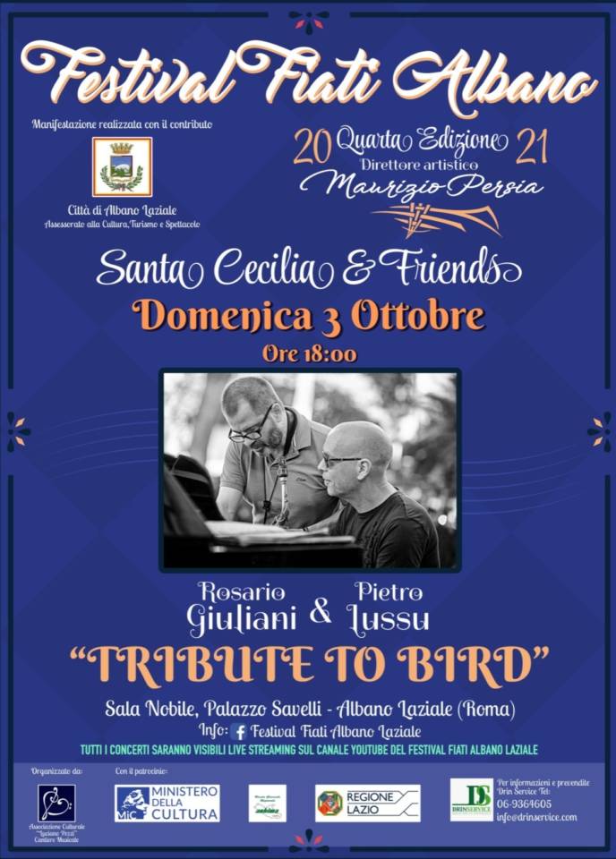 La Sala Nobile di Palazzo Savelli è pronta ad accogliere, domenica 3 ottobre alle ore 18, il debutto della quarta edizione del Festival Fiati Albano Laziale. La serata inaugurale della rinomata kermesse musicale, organizzata dall’Associazione “Luciano Pezzi” sotto la direzione artistica del Maestro Maurizio Persia con il contributo decisivo dell’Assessorato alla Cultura del Comune di Albano Laziale, vedrà esibirsi Rosario Giuliani. Il sassofonista di fama internazionale, insieme al pianista Pietro Lussu, presenterà “Tribute to Bird”. L’ultimo lavoro discografico a firma del tandem Giuliani – Lussu, uscito il 6 maggio 2021 per l’etichetta Emme Record Label, è un omaggio al genio di Charlie Parker nel centenario della nascita. È un autentico tuffo nell’intelletto di un grande artista che parte dal rispetto per la tradizione. Ogni brano, ogni singola nota è frutto di uno studio, di una riflessione che riporta in vita alcuni degli aspetti più nascosti di Parker, artista che ha lasciato un retaggio fondamentale non soltanto per la musica jazz.