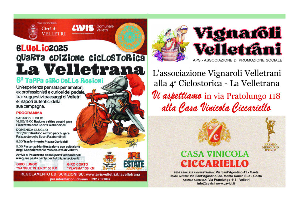 La quarta Ciclostorica (sesta tappa del Giro delle Regioni) organizzata dall’Avis di Velletri unisce sport, solidarietà e scoperta del territorio. Pensata per tutti: ciclisti esperti, appassionati di bici d’epoca, famiglie e cittadini di ogni età. È un evento inclusivo, accessibile e aperto, dove ciascuno può partecipare secondo le proprie possibilità. Un evento che attraversa le strade, la storia e i sapori di Velletri e dei Castelli Romani