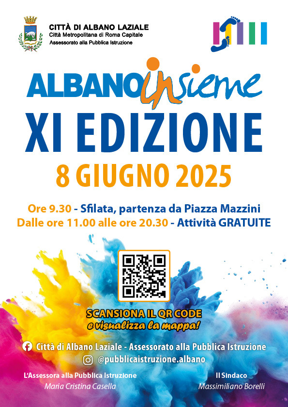 “Albano InSieme… in Festa!” rappresenta il momento culminante del Progetto “Albano InSieme…”, promosso e coordinato dall’Assessorato alla Pubblica Istruzione del Comune di Albano Laziale. Un’iniziativa che, a partire dall’inizio dell’anno scolastico 2024/2025, ha coinvolto l’intera comunità educante: associazioni, volontariato, Forze dell’Ordine e numerosi altri attori del territorio hanno fatto rete, entrando nelle scuole per incontrare studenti e studentesse di ogni età e attivando momenti di apprendimento e di condivisione che hanno reso i nostri giovani veri protagonisti.
