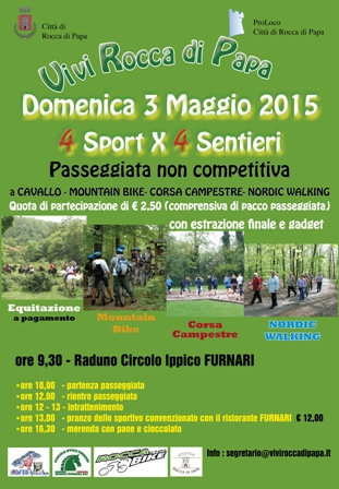 Torna la prossima domenica, 3 maggio, la terza edizione dell’appuntamento insieme sportivo e naturalistico “Vivi Rocca di Papa – 4 sport x 4 sentieri”, organizzato dal Comune di Rocca di Papa, in collaborazione con la Pro Loco e le associazioni sportive del territorio.