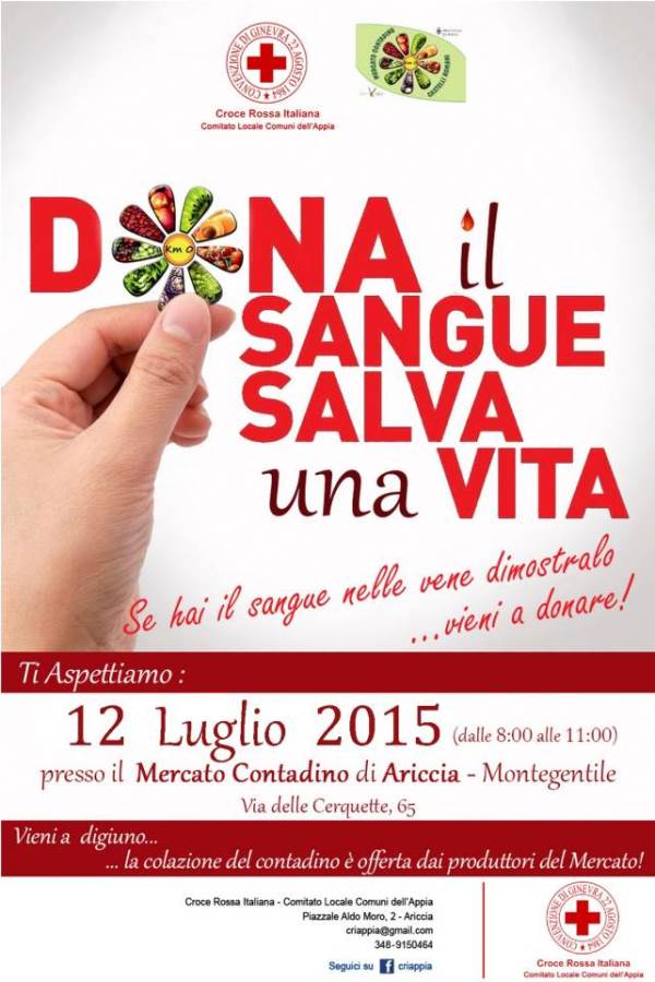 Grazie alla Croce Rossa Italiana (sezione di Ariccia, Genzano e Lanuvio) sarà possibile donare il sangue per salvare una vita: venite a digiuno – al consueto appuntamento ad Ariccia – dalle ore 8 e la colazione del contadino ve la offriranno i produttori del Mercato Contadino Castelli Romani! …frutta freschissima appena raccolta, pane e dolci casarecci, formaggi e frutti di bosco!