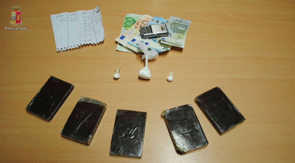 5 “panetti” di hashish e dosi di cocaina nascoste in cucina.