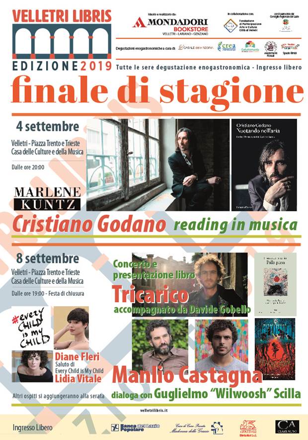 Dopo i successi della stagione 2019 e la pausa estiva, Velletri Libris vi aspetta per due nuovi appuntamenti: una speciale data extra il 4 Settembre dalle ore 20.00 con Cristiano Godano anima, cantante e chitarrista dei Marlene Kuntz che suonerà e racconterà il suo nuovo libro “Nuotando nell’aria” e per la festa finale di Domenica 8 Settembre – slittata di un giorno rispetto all’originaria programmazione – dalle ore 19.00 con molti ospiti. Tricarico, concerto e presentazione del suo libro favola “Palla persa”, Manlio Castagna che dialogherà con Guglielmo Scilla Willwoosh, Diane Fleri e Lidia Vitale testimonial di Every Child is My Child e un brindisi finale per salutare questa splendida stagione e svelarvi nuove sorprese. Gli appuntamenti sono alla Casa delle Culture e della Musica di Velletri, nella magica location del Chiostro, per le ultime date della rassegna ideata e realizzata dalla libreria Mondadori Bookstore Velletri in collaborazione con la Fondazione di Partecipazione Arte & Cultura Città di Velletri. Sul rinnovato sito internet www.velletrilibris.it, si potranno leggere il programma, le biografie degli autori, gli articoli, la rassegna stampa e le attività. Durante le serate come sempre intrattenimento e laboratori per bambini e degustazioni eno-gastronomiche.