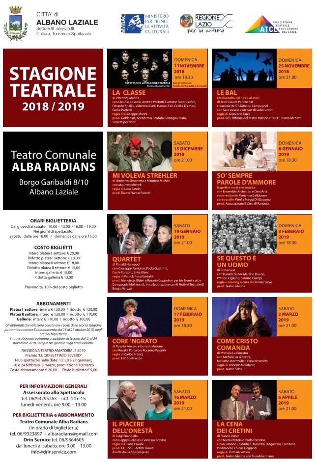 L’Assessorato alla Cultura, Turismo e Spettacolo del Comune di Albano Laziale presenta la stagione teatrale 2017 – 2018 che si terrà presso il Teatro Comunale Alba Radians (Borgo G. Garibaldi, 6) e che vedrà protagonisti grandissimi nomi del teatro italiano e non solo. Da anni la stagione teatrale ha un positivo riscontro di pubblico, come testimoniato dal numero crescente di abbonamenti. Essa è il frutto di una ricerca puntuale tra le compagnie di primo livello sul territorio nazionale che scelgono Albano Laziale come città dove mettere in scena i propri spettacoli teatrali. L’inizio del cartellone sarà preceduto da “Aspettando la Stagione Teatrale” con lo spettacolo “La Classe” di Vincenzo Manna al Teatro Alba Radians, domenica 11 novembre alle ore 18.30. L’apertura della kermesse si terrà domenica 25 novembre alle ore 21 con “Le Bal – L’Italia balla dal 1940 al 2001” di Jean Claude Penchenat. A seguire: sabato 15 dicembre 2018 ore 21.00 “Mi voleva Strehler”; domenica 6 gennaio 2019 ore 18.30 “So’ sempre parole d’ammore”; sabato 19 gennaio 2019 ore 21 “Quartet”; domenica 3 febbraio 2019 ore 18.30 “Se questo è un uomo”; domenica 17 febbraio 2019 ore 18.30 “Core ‘ngrato”; sabato 2 marzo 2019 ore 21 “Come Cristo comanda”; sabato 16 marzo ore 21 “Il piacere dell’onestà”; sabato 6 aprile ore 21 “La cena dei cretini”. Il Consigliere Comunale Vincenzo Santoro ha commentato: «Albano Laziale si conferma una città che crede e investe nella cultura. La stagione teatrale rappresenta un appuntamento fisso della nostra offerta culturale e un punto di riferimento della programmazione autunno – inverno dell’ intero territorio dei Castelli Romani». Alle parole del Consigliere Vincenzo Santoro hanno fatto seguito quelle del Sindaco Nicola Marini: «La nostra Stagione Teatrale non tradisce le attese e si presenta anche quest’anno interessante e coinvolgente. Ancora una volta saranno protagonisti nomi noti del teatro italiano. Non è casuale che da anni la Stagione Teatrale abbia un ottimo riscontro in termini di gradimento e presenze. Ci auguriamo di poter ripetere il successo di pubblico delle passate edizioni, alla luce di un programma rinnovato e di livello, caratterizzato dalla presenza di diversi generi teatrali. Con l’auspicio che la nuova programmazione incontri il Vostro gradimento, auguriamo buon teatro a tutti!».