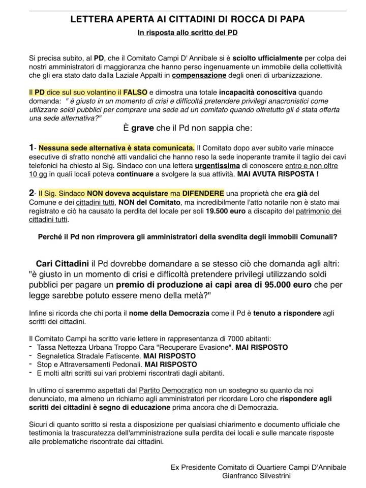 Di seguito riceviamo e pubblichiamo la “lettera aperta ai cittadini di Rocca di Papa in risposta allo scritto del PD” dell’ormai ex presidente del Comitato di Quartiere Campi D’Annibale Gianfranco Silvestrini (vedi anche foto sotto il testo):