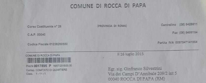 “Egregio sig. Gianfranco Silvestrini, in riferimento a sua dell’11 agosto u.s.acquisita al ns prot n.0019749 nella quale dimostra palesemente il suo forte disappunto per aver perso l’uso del garage di Piazza di Vittorio che Lei ha utilizzato in qualità di presidente de Comitato di Quartiere Campi d’Annibale, ritengo opportuno, pur non essendovi tenuto, riportarle, in sintesi i fatti cosi come si sono verificati. Il 3.6.2015 il Presidente della Sezione Fallimentare di Velletri Dott. Antonino P. La Malfa ha emesso il Decreto di Trasferimento n. 580/2015 attraverso il quale ha trasferito la piena proprietà dell’immobile sito in Rocca di Papa foglio11, particella 34 sub 36, categoria C/6, al sig. Roberto Fondi ingiungendo ad ogni possessore di rilasciare l’immobile nella piena e libera disponibilità dell’aggiudicatario. Al succitato Decreto sono seguite due diffide da parte del sig. Roberto Fondi, indirizzate al Comitato di Quartiere s solo per conoscenza al comune di Rocca di Papa in persona del Sindaco. Con la prima, avente ad oggetto “intimazione di rilascio all’immobile in Rocca di Papa, Piazza G. Di Vittorio 116/A”, assunta al ns protocollo numero 15653 del 23.6.2015, il sig. Roberto Fondi chiedeva al Comitato di Quartiere il rilascio spontaneo dell’immobile entro il 30 giugno 2015 in difetto del quale avrebbe dato mandato per agire esecutivamente. Con la seconda, avente ad oggetto “SIG. R .FONDI/COMITATO DI QUARTIERE CAMPI D’ANNIBALE- DIFFIDA” assunta al ns protocollo numero 16505 del 1.7.2015 l’avv. Giuseppe Mauro, in nome e per conto del sig. Roberto Fondi, rinnovava l’intimazione al Comitato significando al Comune di non aver titolo a ricevere consegna le chiavi. Seguiva una terza diffida dell’ avv. Giuseppe Mauro del 30.7.2015, assunta al prot. 18735 del Comune, attraverso la quale il sig. Roberto Fondi, come sopra rappresentato, contesta la ritardata consegna del locale alla luce del decreto di trasferimento giudiziario sopra emarginato palesando le eventuali ulteriori azioni che porrebbe in essere in caso di ulteriore ritardo nella consegna dell’immobile. Mi preme evidenziare che tutte le diffide erano indirizzate l Comitato in quanto era il Comitato ad averne avuto il possesso qualificato ed in buona fede per oltre un ventennio. Il 29.6.2015, prot, in ingresso 16262, Lei, in nome per conto del Comitato di Quartiere Campi, che possedeva l’immobile oggetto della presente nota, giunta deliberazione di Giunta Municipale numero 1115 del 31.12.1987, si affrettava a fare l’ultima cosa che ci si aspettava facesse, ovvero riconsegnare al Comune di Rocca di Papa, dal quale le aveva ricevute, alcune delle chiavi del locale e comunicava che erano iniziate le operazioni per liberare l’immobile da persone e cose. L’8 luglio u,s prot. In ingresso 17189, sempre Lei, in nome per conto del Quartiere Campi, disattendendo quanto aveva promesso a popolo e Comune ( ovvero che avrebbe mantenuto il possesso e la detenzione con tutti i mezzi e in tutti i modi…), riconsegnava ufficialmente al Comune di Rocca di Papa anche l’ultima chiave di accesso al locale nonché le chiavi dei contatoti Enel e acqua, alzando subito bandiera bianca e cosi attestando pubblicamente che il locale era stato liberato da persone o cose e tornato nella disponibilità del Comune di Rocca di Papa che lo aveva posseduto tramite il comitato Campi. In tale modo di agire volendo, almeno per ora, tralasciare i modi e i termini da Lei usati nei riguardi del sottoscritto Sindaco e della Giunta e della struttura, ha in poche righe annientato la possibilità per il comune di agire come paventato al Presidente della Sezione Fallimentare di Velletri ovvero proporre opposizione agli atti esecutivi paventati dal sig. Roberto Fondi che era stato abilitato in tale senso da un provvedimento della Magistratura. Nell’atto di Giunta Comunale numero 102 del 6.8.2015, per le ragioni di cui sopra, si è ritenuto corretto procedere alla consegna del locale in questione al sig. Roberto Fondi non certo a cuor leggero, come Lei sta cercando di propalare con tutti i mezzi screditando chiunque ha cercato, nel corso degli anni, di porre in essere tutte le azioni lecite e praticabili per risolvere una complicata questione. Per questi motivi le riporto a titolo esemplificativo tutti i tentativi fatti per evitare che accadesse quanto deciso dal Magistrato: Nell’ agosto 2005, il sindaco pro tempore, essendo venuto a conoscenza dell’inserimento dell’immobile nell’ inventario del Fallimento n.2474, inviava una missiva al Giudice Delegato e al Curatore del fallimento, prot. 20566 del 28.9.1995, spiegando le motivazioni ai sensi delle quali il Comune riteneva che l’immobile sarebbe dovuto rimanere estraneo al fallimento, il Giudice ignorava le richieste del Sindaco pro tempore che, in data 2.2.2006. approvava con la Giunta Comunale l’atto n.29, incaricando l’avv. Tiziana D’agostino affinché proponesse formale opposizione alla vendita e all’ inventario del Fallimento n. 2474 della EDIL COSTRUZIONI. Il 20.2.2006 l’avv D’Agostino, in esecuzione della suddetta deliberazione, proponeva opposizione con Istanza di sospensione di vendita, il 24.3.2006 il Giudice dell’Esecuzione rigettava la suddetta istanza e disponeva un nuovo esperimento d’asta. Il 9.8.2008 l’avv D’Agostino sottoponeva al Segretario Comunale, Dott.ssa Stefania Panzironi, un parere pro veritate dichiarando che l’Amministrazione Comunale “non vantava alcun diritto opponibile ai terzi, ovvero al Fallimento, con riferimento al bene distinto in NCEU al f.11, particella 34, sub 36, cat C/6 escludendo l’ipotesi dell’ usocapione”. Malgrado il parere di cui sopra il Sindaco ha tentato un data 27.1.2010 una nuova istanza presso la cancelleria fallimentare chiedendo di nuovo la sospensione di vendita e richiesta di integrazione della perizia estimativa riguardante l’immobile in parola; seguiva la sospensione delle proce