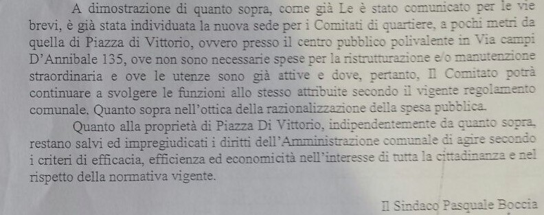 Riportiamo infine “il documento del Sindaco, Pasquale Boccia, circa la vicenda della sede del Comitato di Quartiere Campi d’Annibale, per chiarire e approfondire la vicenda accaduta: