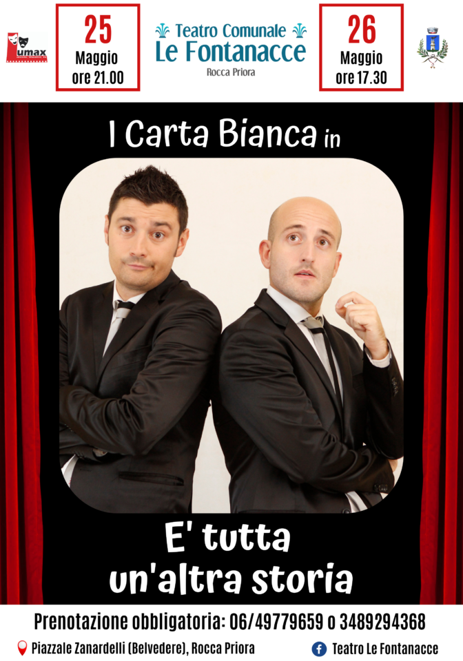Sabato 25 Maggio alle ore 21.00 e Domenica 26 Maggio alle 17.30 saliranno sul palco del Teatro Comunale “Le Fontanacce” di Rocca Priora, diretto dall’attrice Luciana Frazzetto e dal regista Massimo Milazzo, I Carta Bianca con lo spettacolo di cabaret: “E’ tutta un’altra storia”.