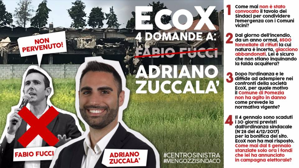 “E’ inevitabile che EcoX sia uno dei temi caldi di questa campagna elettorale a Pomezia. Dieci giorni fa, ad un anno dal disastro EcoX, il candidato Sindaco del Centrosinistra Stefano Mengozzi si era rivolto pubblicamente all’ex Sindaco Fabio Fucci ponendogli quattro domande sulla gestione dell’emergenza e sulle scelte amministrative compiute. Soprattutto Mengozzi, sulla scia di quanto sostenuto in questi anni dai Comitati di Quartiere, chiede spiegazioni sulle 8500 tonnellate di rifiuti che ancora stazionano nel piazzale dell’EcoX. “In dieci giorni nessuna risposta è mai giunta da parte di Fucci – dichiara Mengozzi – in tanti ci chiediamo come mai non risponda….Se non ha nulla da temere”. Visto il silenzio e considerando le recenti dichiarazioni su EcoX dell’ex Presidente del Consiglio comunale e candidato Sindaco Adriano Zuccalà, le quattro domande vengono stavolta girate a lui. “Non cerchiamo polemica – precisa Mengozzi – ma solo risposte. Le aspettiamo noi, i cittadini e le associazioni. Speriamo Zuccalà risponda”.