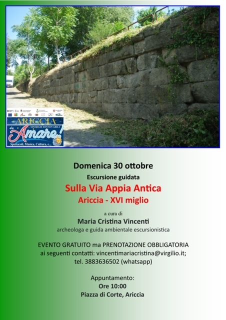 Appuntamento autunnale del progetto “Ariccia da amare” che si svolgerà questa volta sul tracciato della Via Appia Antica XVI miglio ad Ariccia a cura di Maria Cristina Vincenti (PhD in archeologa e guida ambientale escursionistica Aigae).
