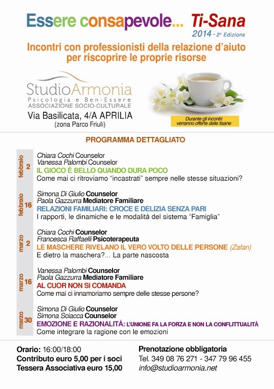 Per “Essere Consapevole Ti-sana” ad Aprilia domenica 16 “Relazioni familiari: Croce e Delizia senza pari”. “Relazioni familiari: Croce e Delizia senza pari” Domenica 16 febbraio torna ad Aprilia l’appuntamento con “Essere Consapevole Ti –sana”, l’iniziativa promossa e organizzata in seconda edizione dall’Associazione Socio Culturale Studio Armonia Psicologia e Ben-Essere dedicato alla scoperta e consapevolezza di sé. Dopo il successo della prima d’apertura che ha raccolto lo scorso 2 febbraio il plauso del pubblico, numeroso nonostante il maltempo, il ciclo d’incontri, prosegue nella sede di via Basilicata 4 A, con Simona Di Giulio (counselor) e Paola Gazzurra (mediatore familiare), per un viaggio teso questa volta alla scoperta e approfondimento dei mille volti delle relazioni familiari . “All’interno di questo seminario – spiega Simona Di Giulio – ci concentreremo sull’approfondimento del significato di “ famiglia”, cercando di capire cosa vuol dire, ripercorrendone l’evoluzione partendo dall’origine, soffermandoci sulle caratteristiche che trasformano una famiglia da funzionale in disfunzionale e sulle conseguenze riversate spesso solo su alcuni individui del sistema. Poiché la famiglia nasce e si sviluppa non solo dall’incontro di due individui, ma di due storie familiari, la creazione di una famiglia diventa, pertanto, un potentissimo mezzo di trasmissione di valori, cultura ma anche ruoli assorbiti nelle rispettive famiglie d’origine e portati avanti, a volte in modo del tutto inconsapevole, da una generazione all’altra“. Dai nostri avi a oggi, un viaggio a ritroso nel tempo e nella storia personale teso, quindi, alla conoscenza e riscoperta di quei “Miti familiari” che hanno fatto di noi quel che tendiamo a essere per ruolo e modalità, ciascuno all’interno del proprio sistema famiglia. “E’ sicuramente un argomento molto denso – ha dichiarato Paola Gazzurra mediatore familiare – che può fornire però una chiave di lettura importante per il “ben-essere personale” e altrettanto necessaria nel momento in cui si decide di costituirsi individui liberi e felici “. Come sempre la degustazione di piacevoli e calde tisane accompagnerà il pomeriggio dei partecipanti che prenderà il via a partire dalle sedici tirando il sipario alle diciotto. Trai i prossimi appuntamenti attesi in calendario sino al prossimo marzo “Le MASCHERE RIVELANO IL VOLTO DELLE PERSONE” (domenica 2 marzo), a cura di Chiara Cochi e Francesca Raffaelli (psicoteraputa); “AL CUOR NON SI COMANDA” (domenica 16 Marzo) con Vanessa Palombi e Paola Gazzurra e per finire “EMOZIONE E RAZIONALITA’: l’unione fa la forza e non la conflittualità” (domenica 30 marzo) condotto da Simona di Giulio e Simona Sciacca (counselor). “L’Associazione – spiega Silvia Moroni psicologa e Presidente dell’Associazione Studio Armonia Psicologia e Ben- Essere – ha come missione la promozione della qualità della vita attraverso esperienze nuove. “Essere Consapevole…Ti–Sana” vuole solleticare una stuzzicante riflessione sul nostro sentire e sul nostro sentirci, avvolti da un ambiente accogliente e sorseggiando una calda tisana.