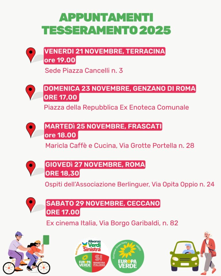 “Come Europa Verde Lazio ci avviamo alla conclusione della campagna di tesseramento 2025 con un calendario di incontri diffusi in diverse realtà del territorio regionale. Un’occasione per confrontarsi con cittadine e cittadini, presentare le iniziative in corso e contribuire alla crescita di una proposta politica che guarda all’ecologia, al sociale e alla tutela culturale e ambientale della Regione Lazio.
