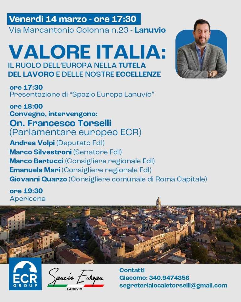 Si svolgerà venerdì 14 marzo dalle ore 17:30 l’inaugurazione del nuovo “Spazio Europa” a Lanuvio. Un luogo fortemente voluto dall’eurodeputato ECR Francesco Torselli, nel quale i cittadini dei Castelli Romani potranno entrare in contatto più da vicino con le istituzioni europee e avere un punto di riferimento per confrontarsi sulla normativa comunitaria.