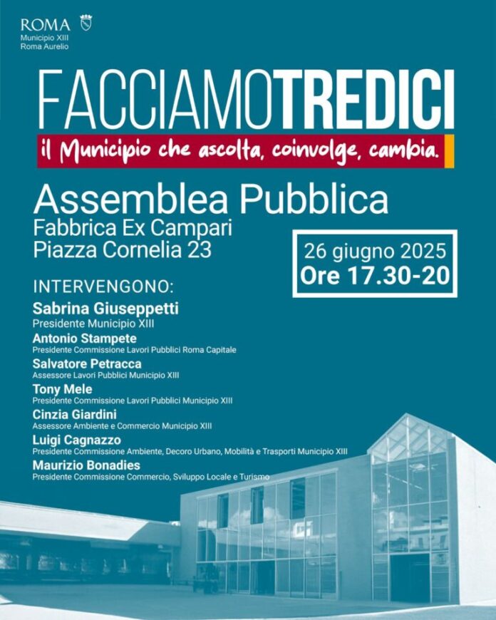 “Giovedì 26 giugno, dalle 17.30 alle 20.00, la Fabbrica Ex Campari di Piazza Cornelia 23 ospiterà la prima Assemblea Pubblica “Facciamo Tredici”, iniziativa promossa dalla Presidente del Municipio Roma XIII Sabrina Giuseppetti e dall’istituzione municipale per presentare quanto realizzato dall’amministrazione, raccogliere proposte dei cittadini e condividere le prossime tappe di sviluppo del territorio.