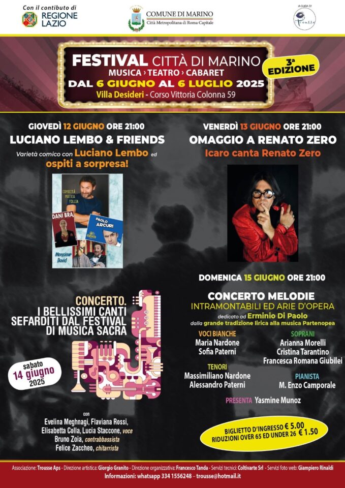 Da giovedì 12 a domenica 15 giugno 2025 fantastico fine settimana al Festival Città di Marino con bravissimi artisti, dall’esilarante spettacolo di Cabaret di Luciano Lembo & Friends il 12, al concerto Icaro canta Renato Zero il 13, ai canti originali Sefarditi, raffinata e rara occasione musicale il 14, alle grandi Melodie Partenopee e le intramontabili arie d’opera il 15, in orario dalle 21.00