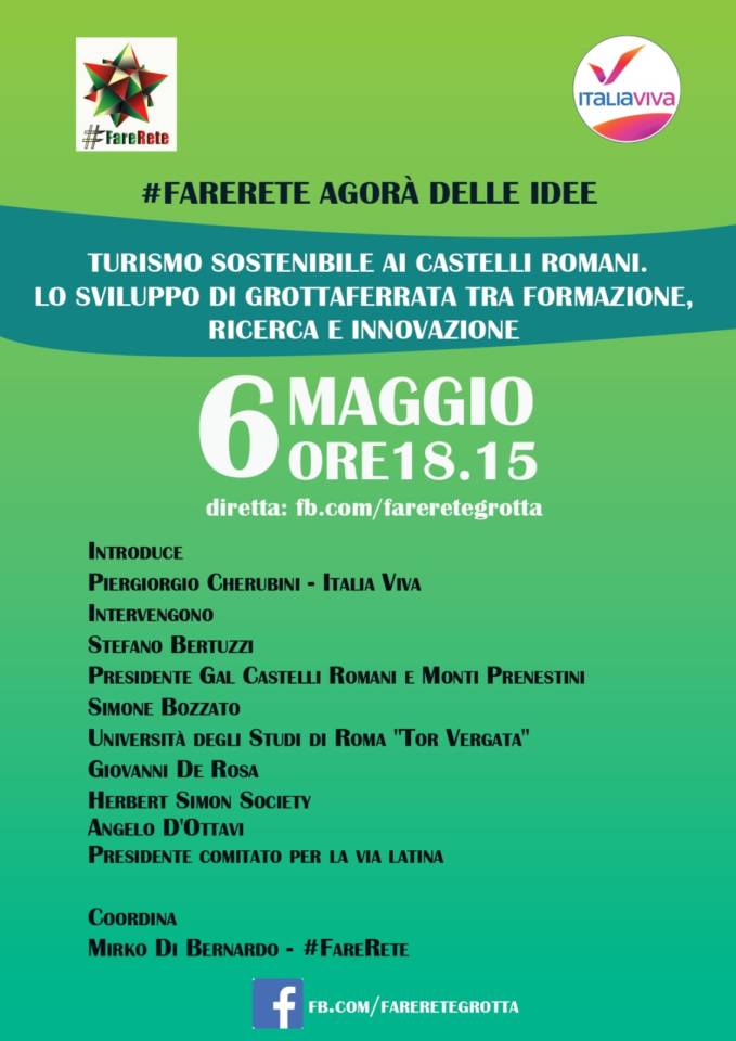 “#FareRete e Italia Viva sono liete di invitare la cittadinanza a partecipare al webinar culturale dal titolo: “Turismo sostenibile ai Castelli Romani. Il ruolo di Grottaferrata tra formazione, ricerca e innovazione”, che avrà luogo il 6 maggio alle ore 18.15 – diretta Facebook: fb.com/fareretegrotta.