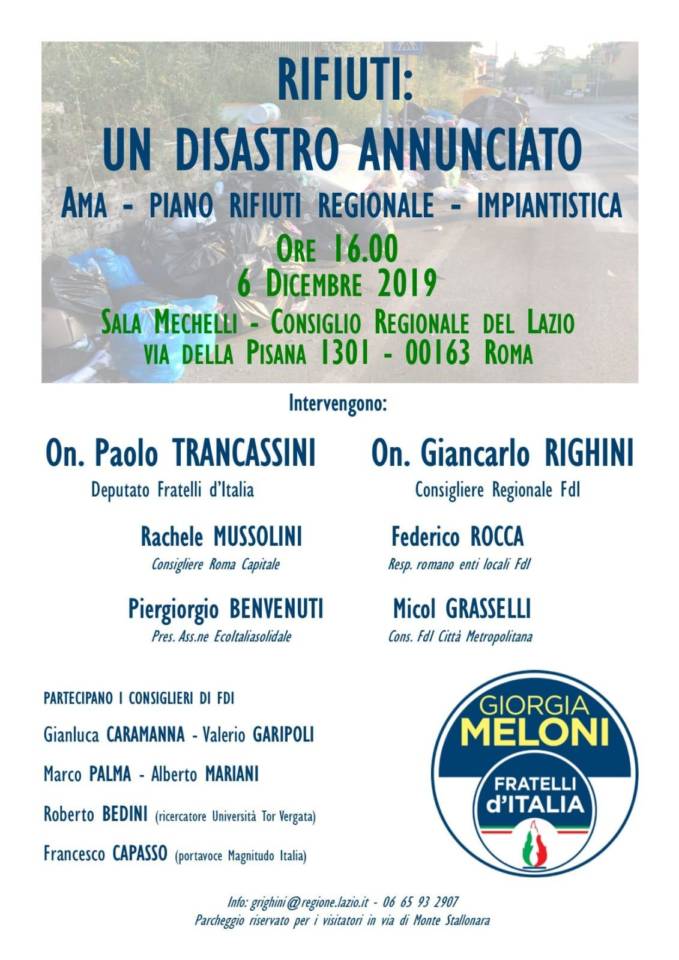 Si terrà venerdì 6 dicembre dalle ore 16.00 in sala Mechelli nella sede del consiglio Regionale del Lazio (via della Pisana 1301), il convegno: “Rifiuti un disastro annunciato: Ama-Piano Rifiuti Regionale – Impiantistica” a cura del consigliere regionale del Lazio di Fdi, Giancarlo Righini che nel presentare l’incontro ha dichiarato: “Anche di fronte all’ordinanza regionale che intima al comune di Roma di individuare i siti delle discariche, il sindaco Raggi continua a non prendere alcune decisione, bloccata nella sua inconcludenza, prigioniera della sua incapacità tecnica e politica di programmare e governare e dei dogmi della decrescita felice di stampo M5 Stelle. D’altro canto la giunta Zingaretti continua a rimandare l’approvazione del Piano Rifiuti Regionale, atteso ormai da sette anni. Noi di Fdi abbiamo del ciclo dei rifiuti una visione innovativa, totale, a basso impatto ambientale, ma siamo consapevoli che oltre ai macro progetti a lungo termine, servono soluzione nell’immediato per scongiurare una crisi ambientale imminente senza precedenti per Roma e per le provincie. Abbiamo organizzato questo convegno per illustrare le nostre proposte e dare un segnale forte sulla necessità immediata di mettere a sistema tutte le professionalità e le competenze politiche, tecniche ed imprenditoriali, stabilire la massima collaborazione tra le istituzioni locali e nazionali per ricostruire l’intera filiera dei rifiuti nella capitale e nella nostra regione”. Partecipano Paolo Trancassini deputato di Fdi, Giancarlo Righini consigliere regionale del Lazio di Fdi, Rachele Mussolini consigliere di Roma Capitale, Federico Rocca Responsabile Romano Enti Locali di Fdi, Piergiorgio Benvenuti presidente EcoItaliasolidale, Micol Grasselli consigliere di Fdi alla Città Metropolitana. Saranno presenti i consiglieri municipali di Fdi. Gianluca Caramanna, Valerio Garipoli, Marco Palma, Alberto Mariani, intervengono,Roberto Bedini ricercatore Università di Tor Vergata, Francesco Capasso portavoce di Magnitudo Italia.