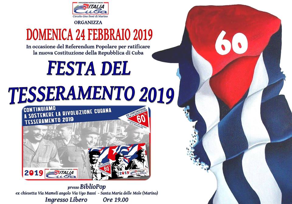 MARINO. BiblioPop: il circolo di Italia Cuba, organizza Festa del Tesseramento nel giorno del Referendum Popolare per la Nuova Costituzione di Cuba. Domenica sera, ore 19.00, ingresso libero.