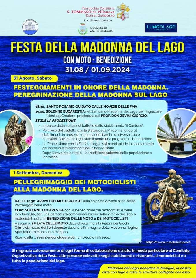 La celebrazione proseguirà con la Benedizione del Lago e il rito di affidamento alla Madonna. Domenica 1 settembre, il weekend festivo culmina con il Raduno dei Motociclisti, un evento imperdibile per gli appassionati delle due ruote, che offre l’opportunità di esplorare le bellezze dei Castelli Romani.
