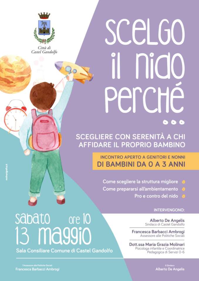 In occasione della Festa della Mamma anche quest’anno il Comune di Castel Gandolfo promuove un incontro dedicato alle mamme e alle famiglie e nello specifico un interessante focus che può essere di supporto nel rapporto con i figli nel delicato momento dei primi mesi e anni di vita. Sabato 13 maggio alle 10 nella Sala Consiliare “Marcello Costa” del Comune di Castel Gandolfo si terrà l’evento “Scelgo il nido perché”, un incontro gratuito e aperto ai genitori e ai nonni delle bambine e dei bambini dagli 0 ai 3 anni.