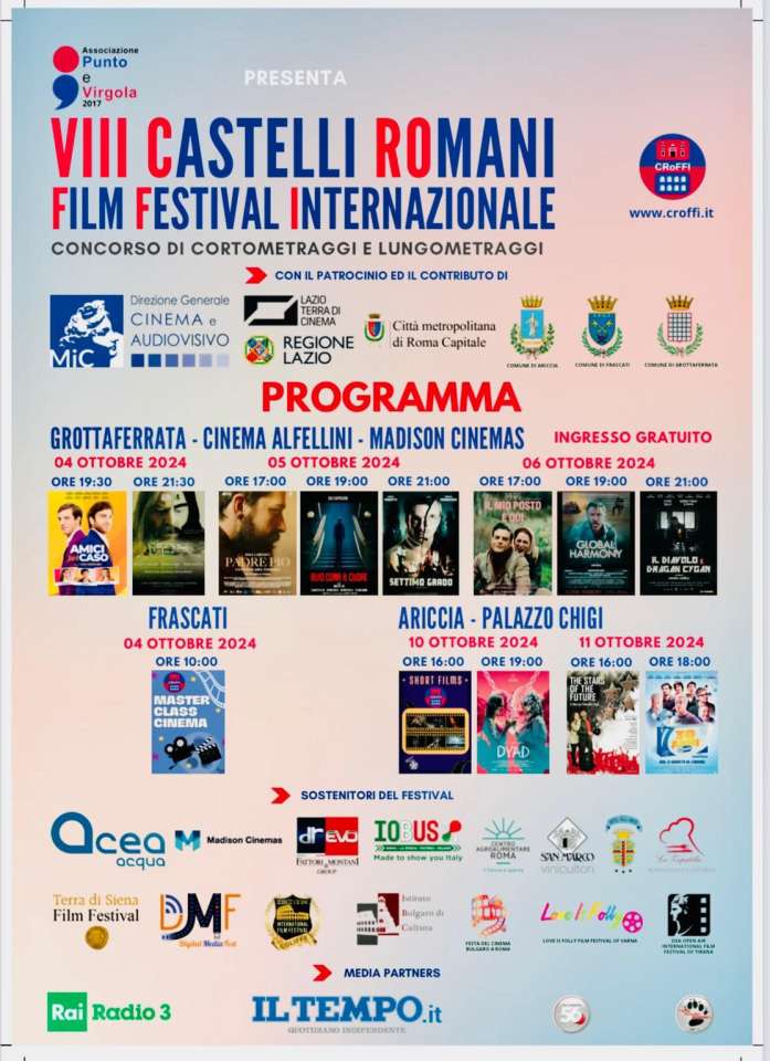 I Castelli Romani tornano protagonisti del Cinema, con l’8^ edizione del CROFFI (Castelli Romani Film Festival Internazionale), che si svolgerà a Grottaferrata, Frascati ed Ariccia dal 4 all’11 Ottobre 2024.