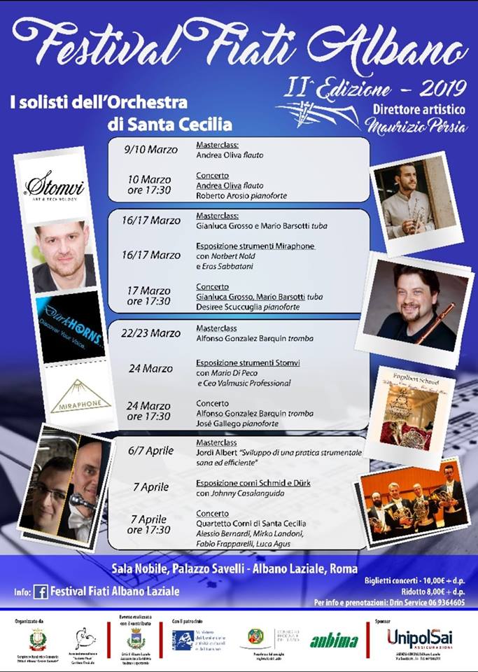 Il Direttore Artistico Maestro Maurizio Persia ha illustrato la II^ edizione del ““Festival Fiati Albano – I solisti dell’Orchestra di Santa Cecilia”: «Ci saranno quattro appuntamenti affidati anche quest’anno a “I Solisti dell’Orchestra di Santa Cecilia”. È un vero onore per noi continuare la collaborazione con i musicisti di un ente così importante, riconosciuto come eccellenza mondiale. Ad inaugurare sarà Andrea Oliva considerato da Sir James Galway “uno dei migliori flautisti della sua generazione, una stella brillante nel mondo del flauto”. Si esibirà in duo insieme al pianista Roberto Arosio con un programma strepitoso. Il secondo appuntamento è affidato ad un insolito quanto intrigante duo di tube e pianoforte. Gianluca Grosso (Santa Cecilia) e Mario Barsotti (Maggio Musicale Fiorentino) entrambi valdostani, ci racconteranno il loro punto di vista attraverso trascrizioni e brani in prima mondiale. Il 24 marzo la nuova prima tromba di Santa Cecilia, lo spagnolo Alfonso Gonzalez Barquin in duo con la pianista Desirèe Scuccuglia, sarà impegnato in un concerto pieno di colore e passione. Ed infine, il 7 aprile, la sezione dei corni dell’Accademia, Alessio Bernardi, Mirko Landoni, Fabio Frapparelli, Luca Agus, con un programma “no limits”, ci stupirà e ammalierà con il suono meraviglioso dei loro strumenti. Ai concerti cameristici saranno affiancate le masterclass degli artisti coinvolti, più quella di Alessio Allegrini, primo corno dell’Orchestra di Santa Cecilia e solista di fama internazionale e, per il secondo anno consecutivo, sarà presente Jordi Albert, esperto di problematiche neuromotorie e di apprendimento che spesso affliggono i musicisti/strumentisti. Durante il Festival saranno allestite importanti esposizioni di strumenti. Marchi mondiali come Miraphone, Stomvi, Dürk, Schmid, metteranno a disposizione i loro ultimi prodotti nel campo degli ottoni. Un ringraziamento sentito a Norbert Nold, Eros Sabbatani, Mario Di Peco, Johnny Casalanguida. Albano Laziale come punto di riferimento culturale italiano del mondo dei fiati, progetto ambizioso e possibile che portiamo avanti con grande impegno e passione».