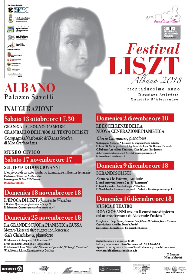 Il programma del Festival Liszt 2018, a cura dell’Associazione Amici della Musica “Cesare De Sanctis” con il contributo dell’Assessorato alla Cultura, Turismo e Spettacolo del Comune di Albano Laziale e la direzione artistica del Maestro Maurizio D’Alessandro, proseguirà anche domenica 18 novembre alle ore 18 presso la Sala Nobile di Palazzo Savelli. Riprenderanno, infatti, i concerti della rassegna lisztiana con lo strepitoso “Quartetto Werther” composto da archi e pianoforte. Il complesso musicale, che si sta imponendo all’attenzione internazionale, interpreterà due capolavori di Brahms (Quartetto Op. 60 n. 3) e Schumann (Quartetto Op. 47).