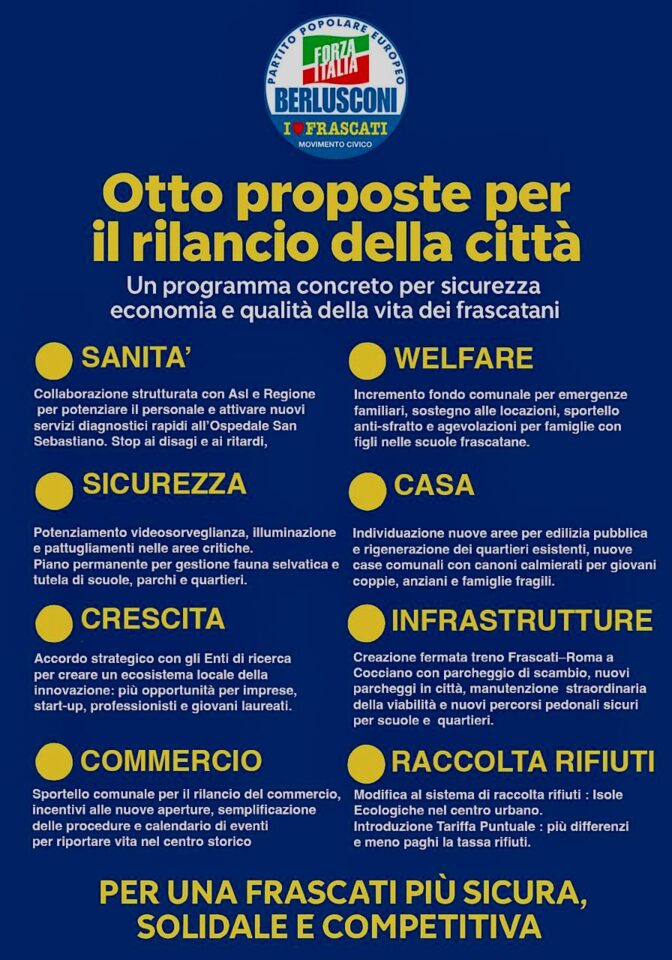 “Forza Italia e il Movimento Civico Io Amo Frascati, in vista delle prossime elezioni amministrative, presentano un documento programmatico articolato in otto proposte concrete, sviluppate per migliorare la sicurezza, la qualità dei servizi, il tessuto economico e il benessere complessivo della comunità frascatana.