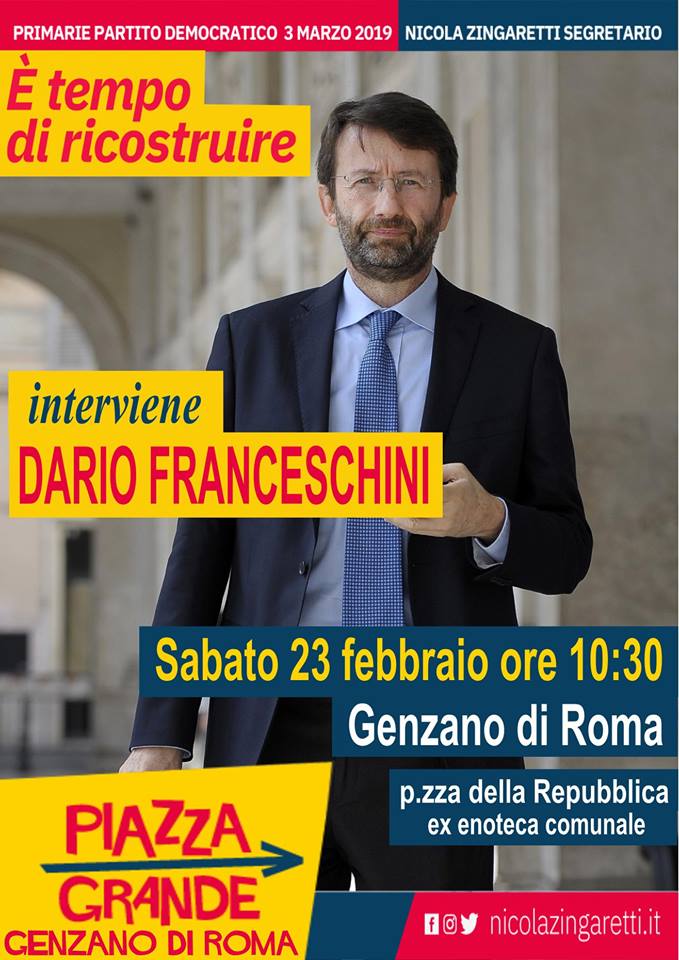 Con questo slogan Piazza Grande Genzano di Roma invita tutti i cittadini a partecipare all’appuntamento di sabato 23 febbraio alle ore 10:30 presso l`ex Enoteca comunale di Genzano di Roma (mercato coperto, Piazza della Repubblica), dove insieme all’onorevole Dario Franceschini, sarà sostenutala candidatura di Nicola Zingaretti alle prossime primarie del 3 marzo del Partito Democratico.Il percorso avviato da Piazza Grande Genzano di Roma, è giunto ad una fase cruciale, il primo vero appuntamento per rigenerare il nostro partito, e ridare forza all’intero centrosinistra di questo Paese.Oggi più che mai c’è bisogno del supporto di tutti coloro che si riconoscono in questo campo, oggi più che mai c’è bisogno di tutti.La data da ricordare è il 3 marzo, dove, sempre presso l’ex enoteca di Genzano si svolgeranno le primarie del Partito Democratico e dove finalmente potremo voltare pagina votando per Nicola Zingaretti. Piazza Grande Genzano di Roma vi invita a votare, possono farlo tutti i cittadini maggiorenni, ma anche i giovani tra i 16 e i 18 anni, i lavoratori e gli studenti fuori sede, gli elettori temporaneamente fuori regione di residenza e i cittadini stranieri, per votare devono registrarsi sul sito del partito democratico entro le ore 12 del 23 febbraio 2019.Rimettiamo al centro le persone.” dichiara Piazza Grande Genzano