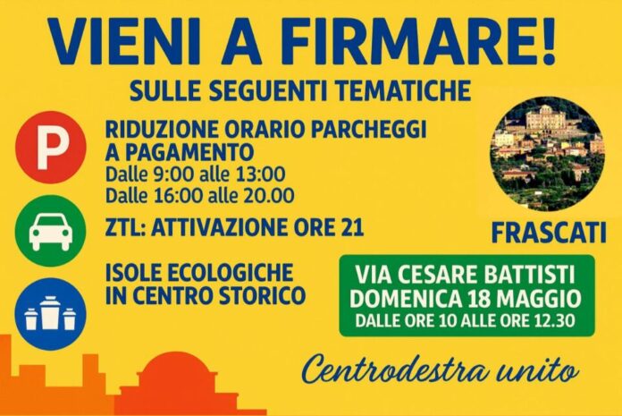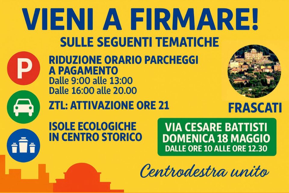 Appuntamento per la raccolta firme: Domenica 18 maggio dalle ore 10:00 alle 12:30 in Via Cesare Battisti – Frascati