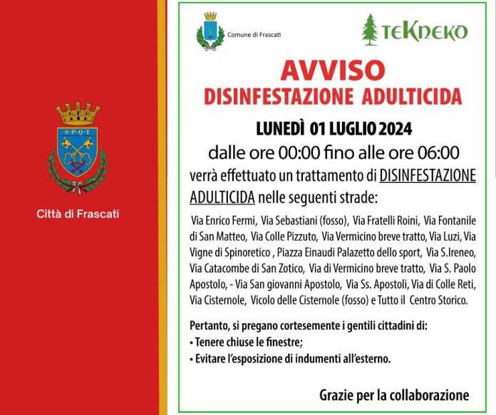 “Apprendiamo dal Comune di Frascati che il Primo Luglio si effettuerà interventi di disinfestazione adulticida in alcune strade della periferia di Frascati. Nell’elenco compaiono molte strade ma ne mancano altre e chiediamo il perché di questa scelta. L’interrogativo lo giriamo all’Amministrazione”.