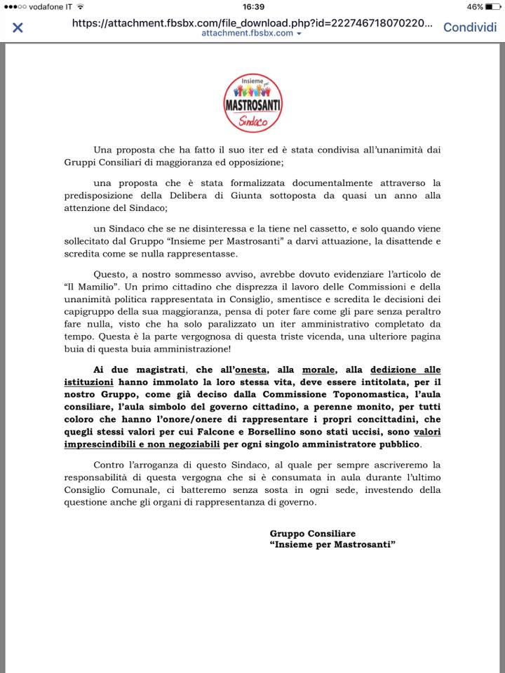 Una proposta che ha fatto il suo iter ed è stata condivisa all’unanimità dai Gruppi Consiliari di maggioranza ed opposizione; una proposta che è stata formalizzata documentalmente attraverso la predisposizione della Delibera di Giunta sottoposta da quasi un anno alla attenzione del Sindaco; un Sindaco che se ne disinteressa e la tiene nel cassetto, e solo quando viene sollecitato dal Gruppo “Insieme per Mastrosanti” a darvi attuazione, la disattende e scredita come se nulla rappresentasse. Questo, a nostro sommesso avviso, avrebbe dovuto evidenziare l’articolo de “Il Mamilio”. Un primo cittadino che disprezza il lavoro delle Commissioni e della unanimità politica rappresentata in Consiglio, smentisce e scredita le decisioni dei capigruppo della sua maggioranza, pensa di poter fare come gli pare senza peraltro fare nulla, visto che ha solo paralizzato un iter amministrativo completato da tempo. Questa è la parte vergognosa di questa triste vicenda, una ulteriore pagina buia di questa buia amministrazione! Ai due magistrati, che all’onesta, alla morale, alla dedizione alle istituzioni hanno immolato la loro stessa vita, deve essere intitolata, per il nostro Gruppo, come già deciso dalla Commissione Toponomastica, l’aula consiliare, l’aula simbolo del governo cittadino, a perenne monito, per tutti coloro che hanno l’onore/onere di rappresentare i propri concittadini, che quegli stessi valori per cui Falcone e Borsellino sono stati uccisi, sono valori imprescindibili e non negoziabili per ogni singolo amministratore pubblico. Contro l’arroganza di questo Sindaco, al quale per sempre ascriveremo la responsabilità di questa vergogna che si è consumata in aula durante l’ultimo Consiglio Comunale, ci batteremo senza sosta – si conclude così la nota – in ogni sede, investendo della questione anche gli organi di rappresentanza di governo”