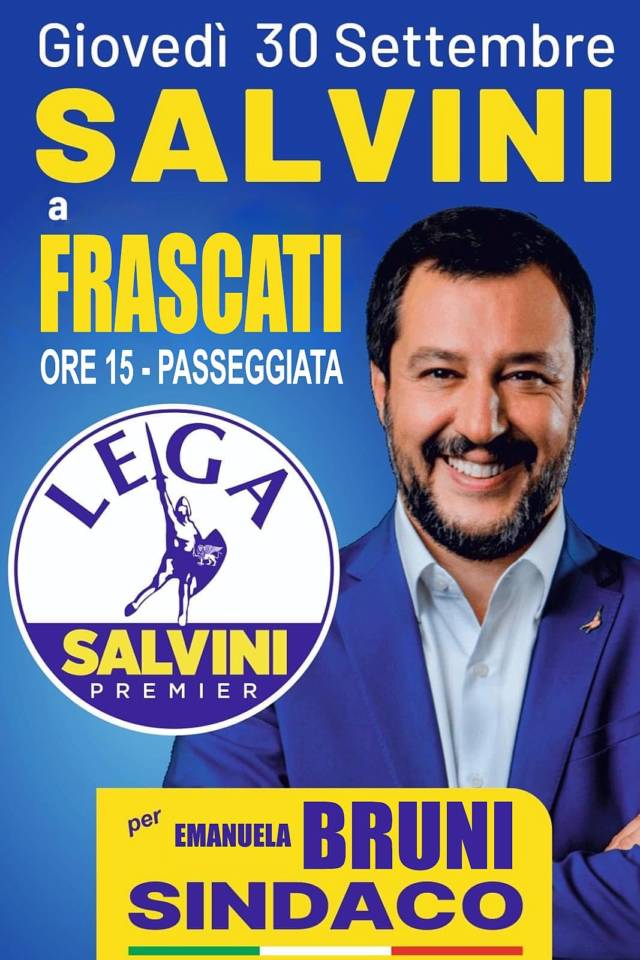 Siamo lieti di dare conferma che il Sen. Matteo Salvini sarà presente a Frascati giovedì 30 settembre dalle ore 15:00, per un caffè al centro e l’intervento alla manifestazione di chiusura della campagna elettorale della Lega per Emanuela Bruni Candidato Sindaco della coalizione di centrodestra, che si terrà in Via Vittorio Veneto (Passeggiata).