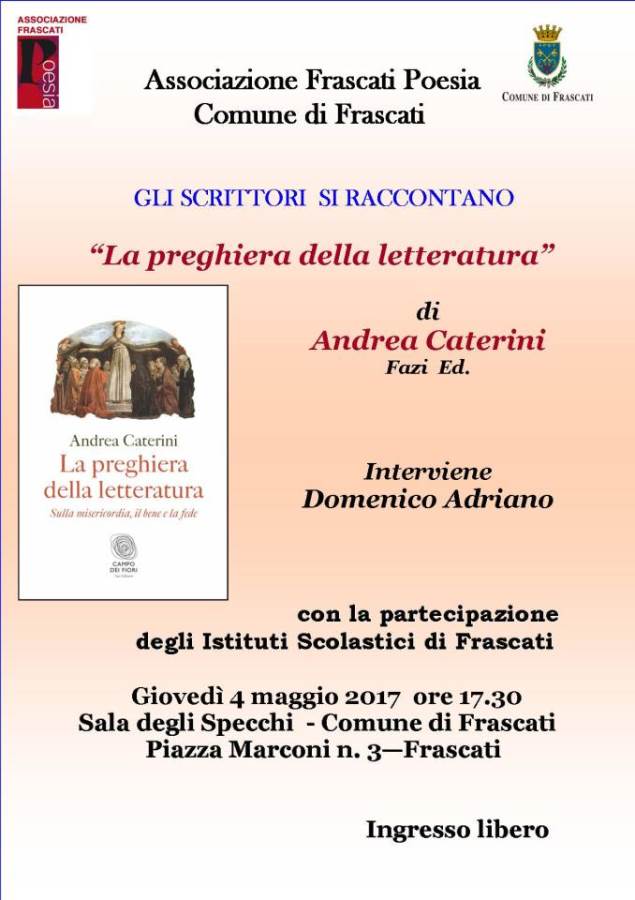L’Associazione Frascati Poesia in collaborazione con il Comune di Frascati, presenta Giovedì 4 maggio 2017 alle ore 17.30 presso la Sala degli Specchi del Comune di Frascati. Il nuovo libro di Andrea Caterini “La preghiera della letteratura” – Fazi Editore. Introduce Domenico Adriano. Andrea Caterini , scrittore e saggista, ci propone una riflessione su alcuni termini chiave della Cristianità: Pace, Sacrificio, Misericordia, Bene, Santità e Fede. Attraverso la comprensione di queste parole, Caterini si accosta alla letteratura attraverso autori quali Achmatova Anna, Sant’ Agostino, Dante Alighieri, Virgilio, Anton Cechov e molti altri. La preghiera della letteratura vuole essere un libro di pensiero, in un momento storico in cui nessuno è davvero immune dalla vacuità e dalle chiacchiere. Pregare significa anche concentrare tutta la nostra attenzione sul significato delle parole che si pronunciano. E allora Caterini ragiona su queste, provando a farle diventare un’esperienza (una ragione) di vita. Partecipano all’incontro gli studenti degli Istituti Scolastici di Frascati. Ingresso libero Info: frascatipoesia@comune.frascati.rm.it