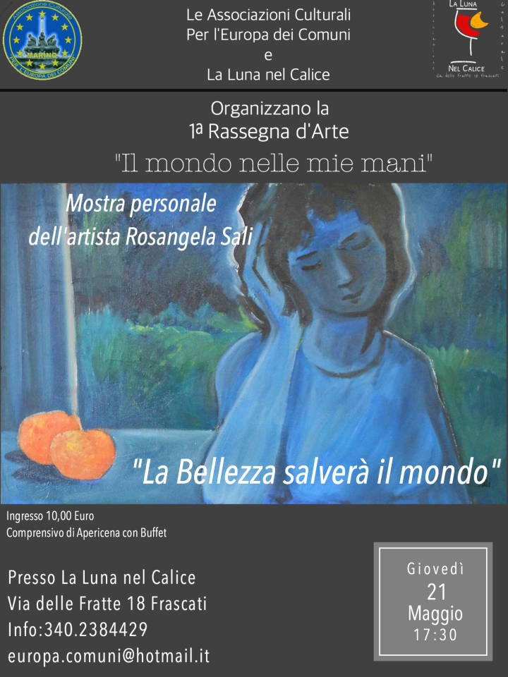 La prima Edizione della Rassegna d’Arte Il mondo nelle mie mani promossa dall’ Associazione culturale marinese Per l’Europa dei Comuni con la partecipazione dell’Associazione culturale frascatana La Luna nel Calice, si svolgerà giovedì 21 maggio alle 17.30 presso La Luna nel Calice in via delle Fratte 18 a Frascati (RM). La kermesse si aprirà con la mostra personale dell’artista Rosangela Sali dal titolo La Bellezza salverà il mondo.