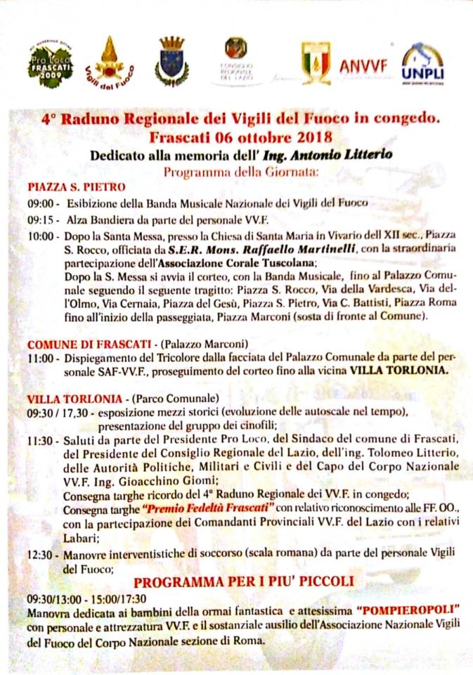 Si rinnova, anche quest’anno, il consueto appuntamento con il Corpo Nazionale dei Vigili del Fuoco. La vicinanza della Pro Loco di Frascati con i pompieri è oramai nota a tutti: il Presidente e diversi componenti della Pro Loco sono ex pompieri e, come tali, ci ricordano che un vero Vigile del Fuoco rimane sempre tale. Queste ragioni e per quel sentimento che lega la figura del pompiere alla popolazione è stato organizzato il prossimo raduno insieme ai vertici ed alla dirigenza del Corpo Nazionale dei VV.F. Non solo ha risposto tutto il Corpo Nazionale, ma anche l’Associazione Nazionale dei Vigili del Fuoco, insieme ai Comandi Provinciali ed ai Comuni vicini. Così facendo il Raduno è diventato Regionale ed ha potuto diventare un momento di raccolta e di riflessione, fra tutti coloro i quali gestiscono il territorio e portano il loro soccorso che, viene definito normalmente soccorso tecnico urgente. Vogliamo soffermarci sul significato che, quest’anno, assume una manifestazione dedicata all’Ingegner Antonio Litterio. Quest’ultimo ha brillato per la sua significativa carriera all’interno del Corpo Nazionale dei Vigili del Fuoco, assumendo le massime cariche e divenendo Capo del Corpo. A lui è seguito il figlio Tolomeo, attualmente impegnato nella dirigenza, proprio nelle scuole che furono dirette dal Padre. Le recenti rinnovate cariche presso il Comando di Roma e l’Ispettorato Regionale dei Vigili del Fuoco fanno riferimento rispettivamente a: l’ingegner Giampietro Boscarino e all’ingegner Claudio De Angelis che hanno assicurato la loro presenza. A questi ultimi farà da contraltare l’imponente presenza del Capo del Corpo, l’ingegner Gioacchino Giomi che ha assicurato la propria presenza al pari degli altri subordinati. Il 4° Raduno, dunque, si presenta ricco di presenze e dirigenti, appartenenti al Corpo Nazionale dei Vigili del Fuoco, che tanto si prodigano per dare alla popolazione sicurezza e conforto laddove e, quando, necessario. A tanta qualificata dirigenza fa da corona il personale in servizio ed in congedo che numeroso prende parte alla riunione e che, come da tradizione, partecipa anche all’incontro conviviale. Qui si rinnovano aneddoti, sodalizi ed amicizie che danno ai pompieri quell’aspetto di fratellanza, familiarità e goliardia destinato ad alleviare il loro operato nelle impegnative, professionali, azioni di soccorso. Durante il Raduno avremo anche il piacere di rinnovare l’incontro con l’Associazione Nazionale Vigili del Fuoco Sede di Roma che attraverso il proprio impegno, con l’ausilio delle consorti, daranno vita a “Pompieropoli”, va sottolineato che l’associazione si muove autonomamente a titolo di solidarietà e si prodiga per presentare ai più piccoli tutte le sfumature e le attraenti operazioni di spegnimento e di addestramento riservate ai Vigili del Fuoco. La cornice di Villa Torlonia sarà la sede dell’incontro, dove potremmo ammirare gli automezzi esposti, invece una breve cerimonia presso le Scuderie Aldobrandini consentirà al Presidente della Pro Loco di Frascati, Antonio Mercuri, di consegnare le targhe ricordo agli intervenuti ed alle Forze dell’Ordine invitate per l’occasione