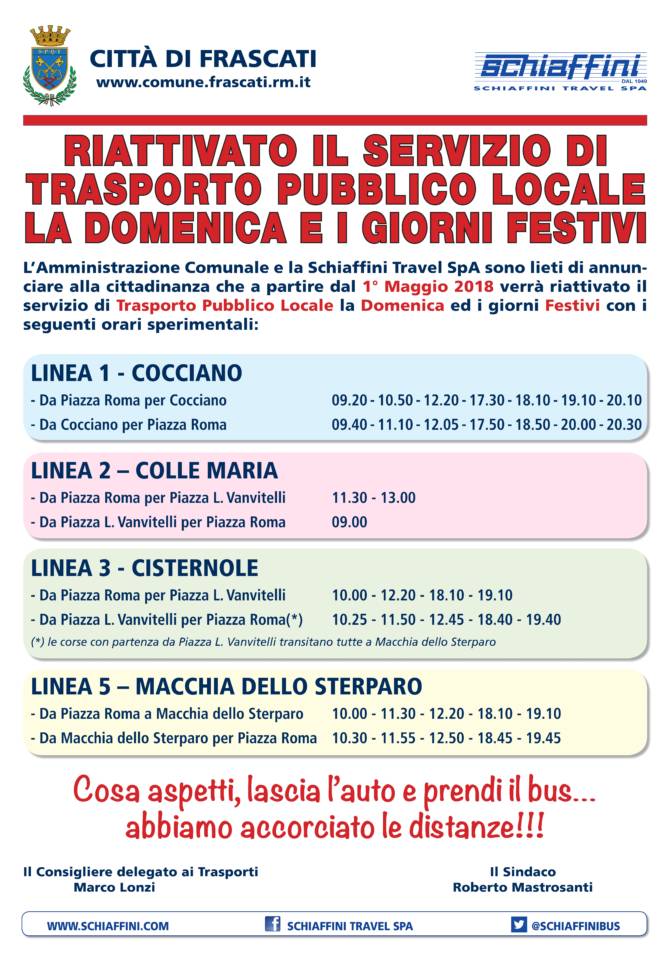 Da martedì prim maggio 2018 sarà riattivato il Servizio di Trasporto Pubblico Locale la domenica e i giorni festivi. «Come annunciato nelle scorse settimane, l’Amministrazione comunale, in collaborazione con la ditta Schiaffini Travel Spa, ha voluto dare un ulteriore segnale forte della sua attenzione nei confronti delle periferie, istituendo il TPL anche nelle domeniche e nei giorni festivi – dichiara il Sindaco di Frascati Roberto Mastrosanti -. Questo consentirà ai cittadini di potersi spostare con facilità anche nei giorni di festa e raggiungere il centro cittadino».