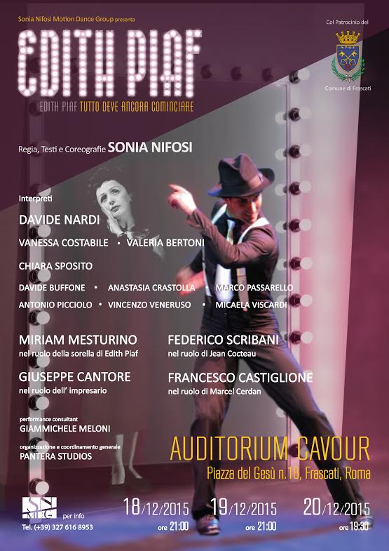 In occasione del debutto del 18 dicembre 2015 presso l’AUDITORIUM CAVOUR di Frascati, Roma (P.zza del Gesù 18), il relatore Giammichele Meloni presenterà lo spettacolo “EDITH PIAF, tutto deve ancora cominciare”, introducendo la vita e la storia della straordinaria cantante francese Edith Piaf e immergendo il pubblico verso i più celati processi creativi della messa in scena dell’opera coreografica di Sonia Nifosi.