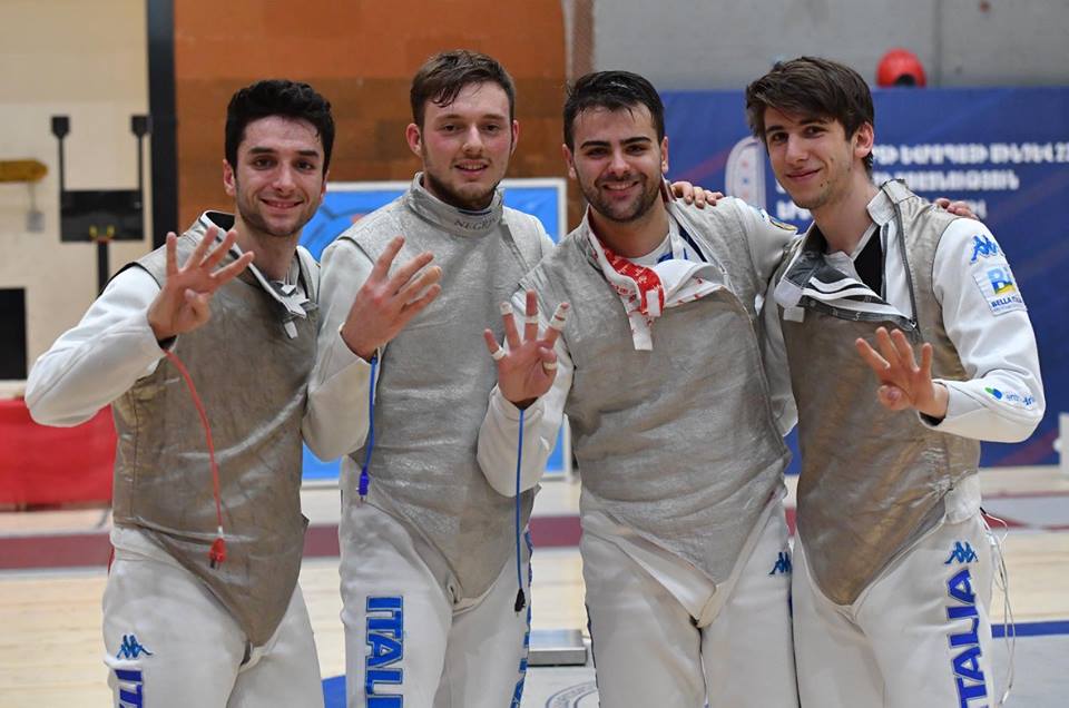 Gli Europei Under 23 si sono chiusi col botto per il Frascati Scherma. A Yerevan (Armenia) i ragazzi tuscolani hanno conquistato un fantastico oro a squadre sia nella sciabola con Federico Riccardi sia nel fioretto con Guillaume Bianchi e Damiano Rosatelli. I primi a salire sul tetto d’Europa sono stati gli sciabolatori azzurri: Riccardi e i compagni Dario Cavaliere, Francesco Bonsanto, Leonardo Dreossi, dopo aver superato ai quarti l’Ungheria con il punteggio di 45-41, hanno avuto la meglio in semifinale sulla Bielorussia per 45-36 ed infine, nell’assalto valido per il titolo, hanno sconfitto la Francia col punteggio di 45-41. Perfetto anche il percorso dei fiorettisti: la coppia Bianchi-Rosatelli, assieme agli altri due azzurri Francesco Ingargiola e Davide Filippi, dopo aver sconfitto ai quarti la Polonia col punteggio di 45-33, ha avuto ragione in semifinale della Francia per 45-39 e poi in finale ha ottenuto un netto successo contro la Russia (45-31) che è valso il titolo continentale.