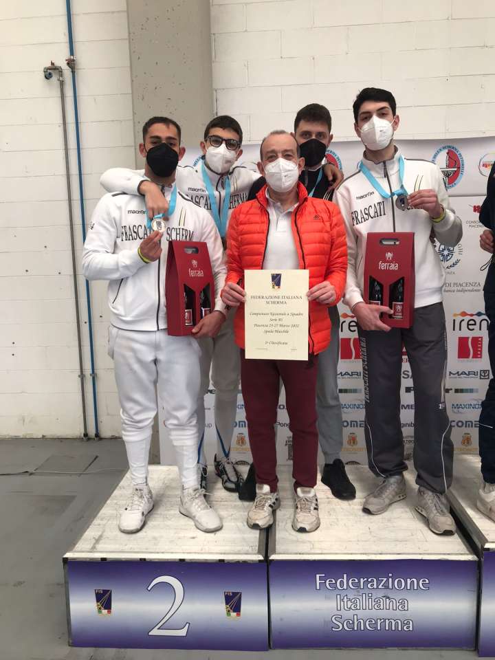 E’ stata festa-promozione anche per la squadra di sciabola maschile composta da Andrea Mignucci, Alessandro Perugini, Leonardo Tocci e Lupo Veccia Scavalli. Il team tuscolano, seguito in pedana dal maestro Nico Bonsanto, è stato promosso nella serie A1 dopo il terzo posto ottenuto nella gara in terra emiliana. Un bel percorso culminato con il “derby castellano” in semifinale contro la Ss Lazio Scherma Ariccia che si è imposta per 45-32, mentre in precedenza i frascatani avevano sconfitto nei quarti di finale l’Accademia d’Armi Musumeci Greco. Nella finale per il terzo posto, però, i nostri ragazzi hanno messo alle spalle la delusione con gli ariccini e si sono imposti con uno squillante 45-35 sul Cus Padova, salendo sul gradino più basso del podio.