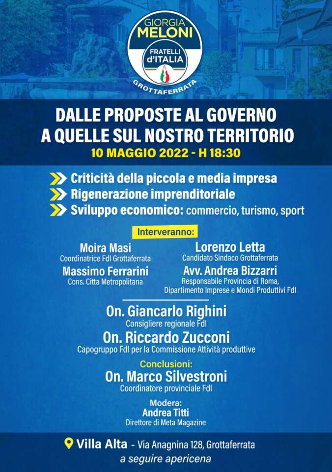 “Dalle Proposte al Governo a Quelle sul Nostro Territorio – criticità della piccola e Media impresa, rigenerazione imprenditoriale, sviluppo economico, commercio, turismo, sport”: è il titolo dell’evento promosso da Fratelli d’Italia, che si terrà il prossimo 10 Maggio, a partire dalle ore 18:30, nello scenario di Villa Alta, in via Anagnina 128 a Grottaferrata.