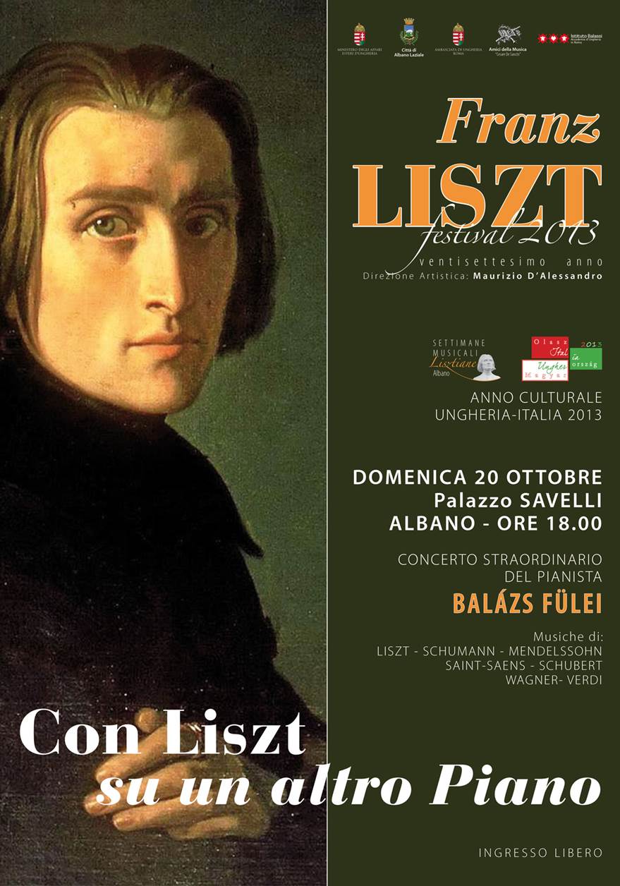 Nell’ambito dell’Anno Culturale Ungheria-Italia 2013, domenica 20 ottobre 2013, alle ore 18.00 presso la Sala Nobile di Palazzo Savelli ad Albano si terrà il concerto del pianista ungherese Balázs Fülei. Si tratta del concerto straordinario che aprirà il Festival Liszt di Albano giunto al suo 27° anno. Un festival nato in omaggio al rapporto che Liszt ha avuto con Albano durante i suoi anni romani. Il livello altissimo dei concerti ai quali si sono affiancati negli anni studi lisztiani di respiro internazionale lo pongono ormai come un festival lisztiano di riferimento in Italia e tale da essere riconosciuto e segnalato come eccellenza a Bologna dalla Fondazione Liszt nell’ambito delle Giornate europee del patrimonio 2013.