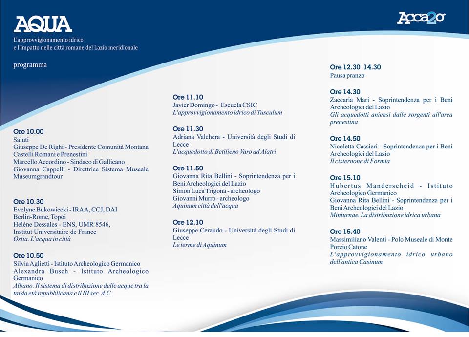 Anche per questo è stata scelta come sede dell’incontro di studi Gallicano nel Lazio, dove si trovano gli splendidi resti degli acquedotti Anio Vetus, Aqua Marcia, Anio Novus e Aqua Claudia che costituiscono un itinerario musealizzato di estremo interesse che attraversa un territorio tra i più affascinanti della Campagna Romana.