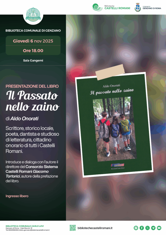 Il suo nuovo lavoro editoriale, Il passato nello zaino, stampato a settembre scorso per i tipi di Controluce, verrà presentato in anteprima in biblioteca a Genzano giovedì 6 novembre prossimo alle 18:00.