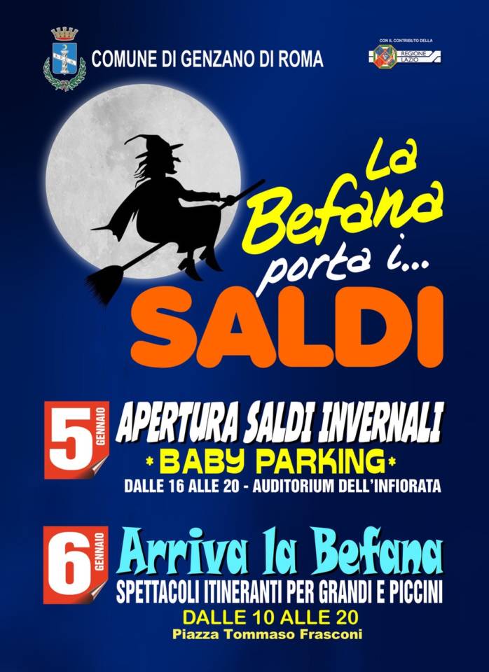 A Genzano la Befana porta… i saldi! Venerdì 5 gennaio si apre infatti la stagione delle svendite invernali tra le vie genzanesi. E mentre i genitori potranno dedicarsi agli acquisti, abbiamo pensato anche ai più piccini grazie a un servizio di animazione che si terrà all’interno dell’auditorium dell’Infiorata a piazza Don Fabrizi. Il 6 gennaio la Befana arriverà a piazza Frasconi – a cura della Croce Rossa – portando a tutti i bambini le calze che l’Amministrazione comunale ha fatto preparare con dolcetti artigianali e tante caramelle golose! La giornata sarà allietata dalla presenza di artisti di strada itineranti, trampolieri, truccabimbi, baby dance e molto altro. Per il programma completo delle attività vi invitiamo a visitare il sito istituzionale del Comune all’indirizzo: www.comune.genzanodiroma.roma.